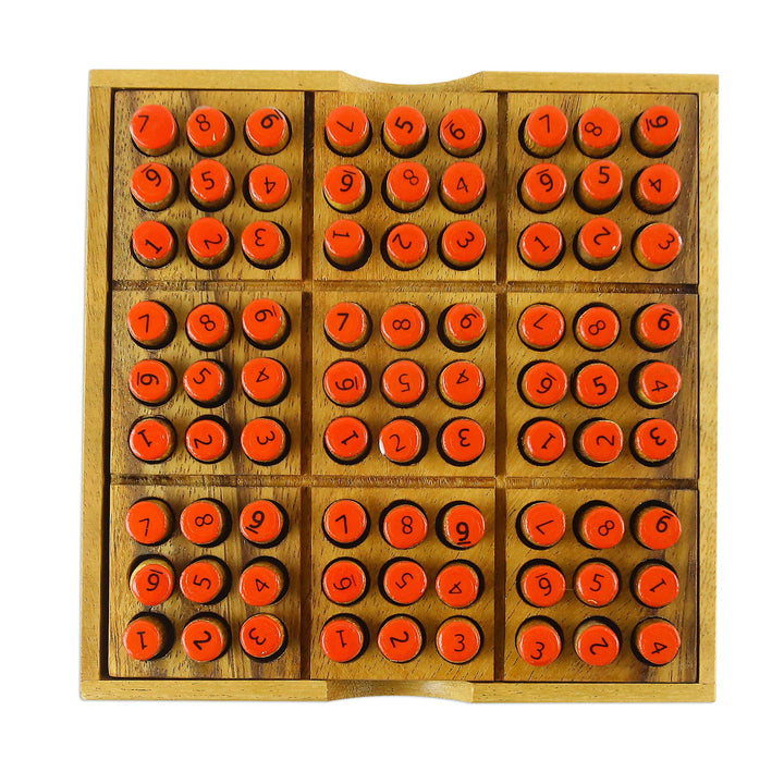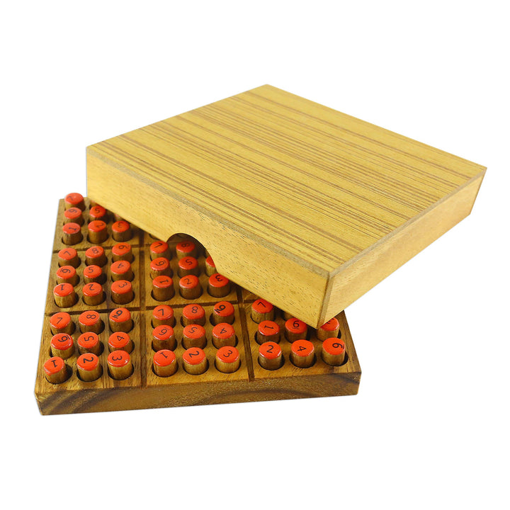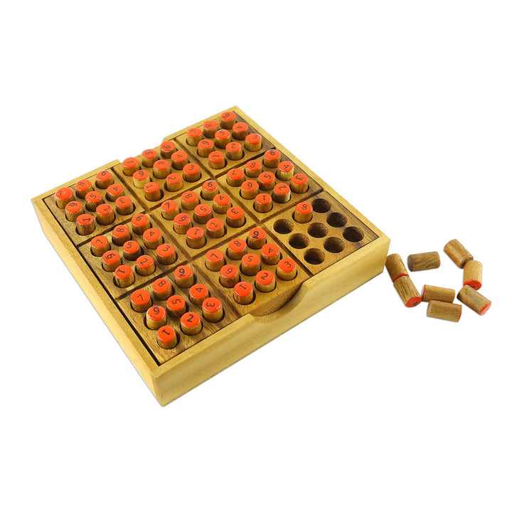 Featuring an assortment of numbered pegs on a 3x3 grid, this logic puzzle from Thailand brings the contemplative fun of sudoku to any home. Within each sectioned block are the numbers one through nine, identified by the orange pegs that fit into the board. The objective of the game is to arrange the pegs so that each column, each row, and each of the nine 3×3 grids contain all of the digits from 1 to 9. Handcrafted by Waraporn Khamsuk, this game offers an exciting challenge.
