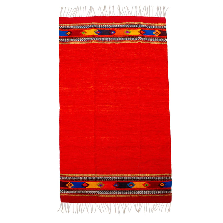 A brilliant red ground is bordered by traditional Zapotec motifs in royal blue, maroon and saffron in this area rug from Alberto Ruiz. The Mexican artisan uses a treadle loom and pure wool yarns to weave the rug by hand. As is customary in that area, the yarns are dyed with all-natural materials such as cochineal, tree bark and dried flowers. Hand-knotted fringe adorns both ends.