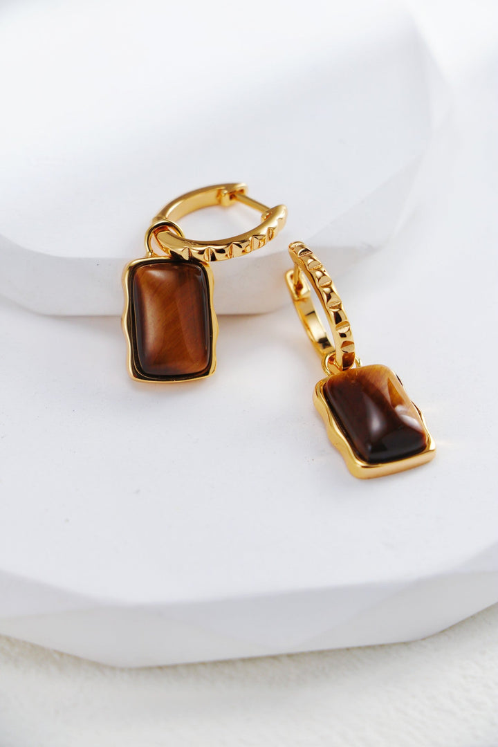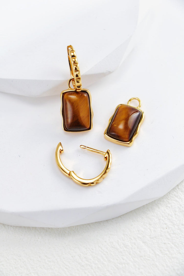 The necklace comes with a delicate silver chain, adding a touch of elegance. The cleverly designed earrings can be worn in two ways, with detachable gold huggies and pendants. You can wear the huggies with the tiger's eye pendants or just the huggies alone by taking off the pendants.