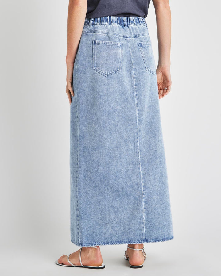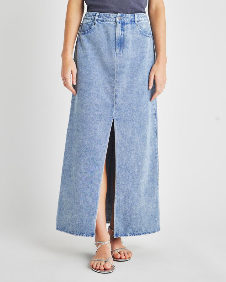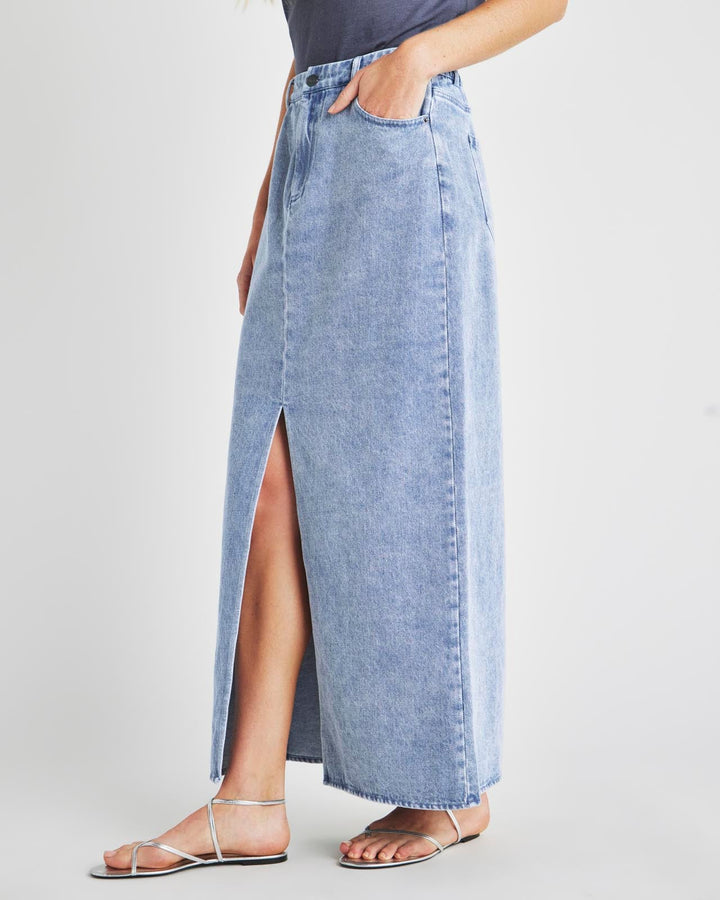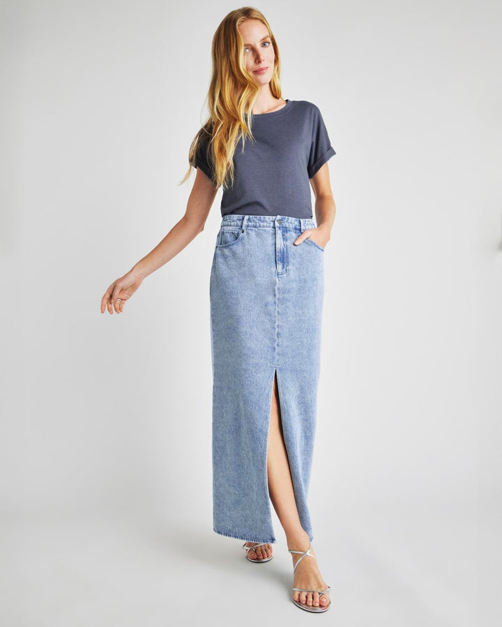 When spring is in, swap your jeans for the Rhiannon Denim Maxi Skirt. Made from a light wash denim, its high rise waist welcomes all tucked-in tops (and crop tops). Bonus: the back waist has a stretch band for extra comfort and the perfect fit. We also love how the front slit highlights any shoe you pair it with.