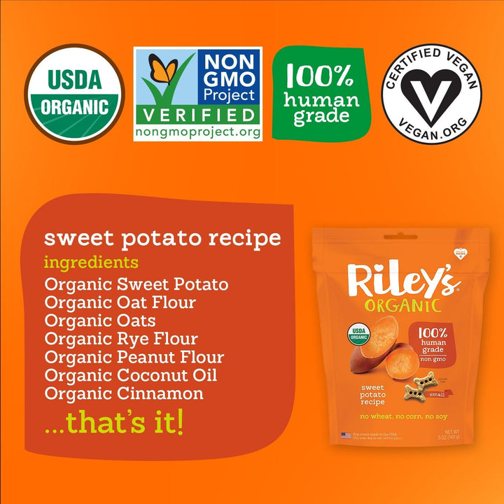 Riley’s Treats are made with limited ingredients, are USDA Certified Organic, Non-GMO, Human Grade, Certified Vegan and Made in the USA. They are wheat, corn and soy free.