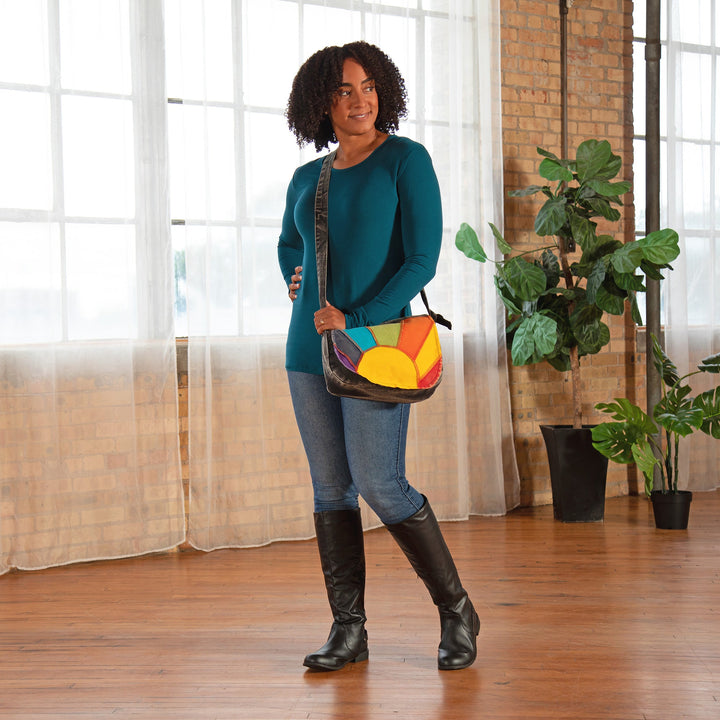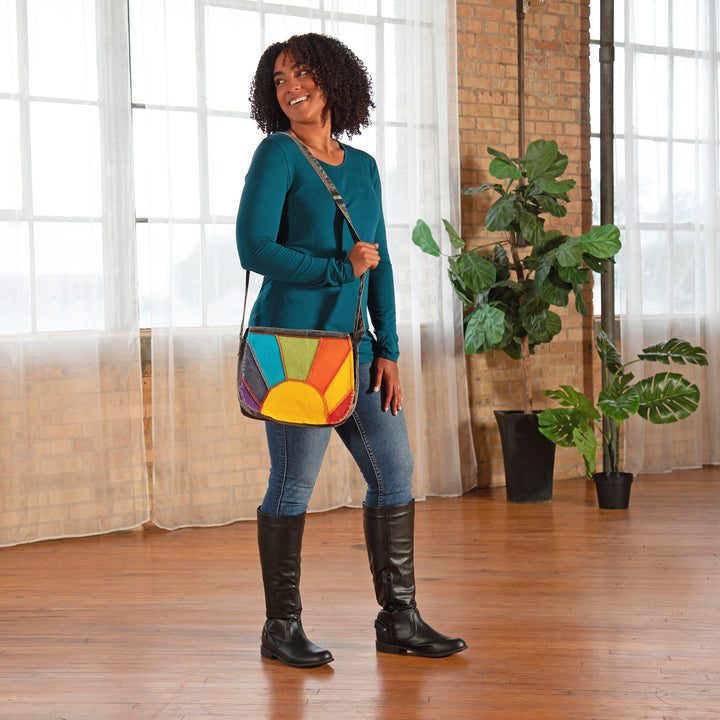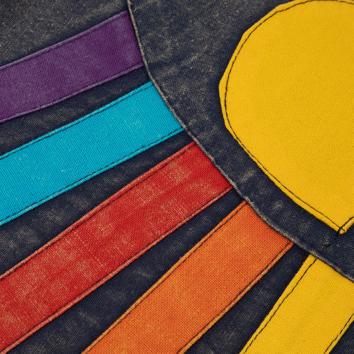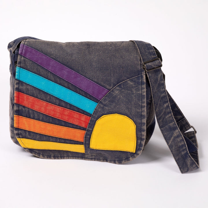 Brightly dyed accents are sewn on the black stone washed fabric in this handcrafted, artisan-made messenger bag. Choose from a centered sun or a corner sun with colorful rays on the front flap of the bag, and complete with an adjustable strap, zipper pockets, and a hefty 100% cotton fabric.