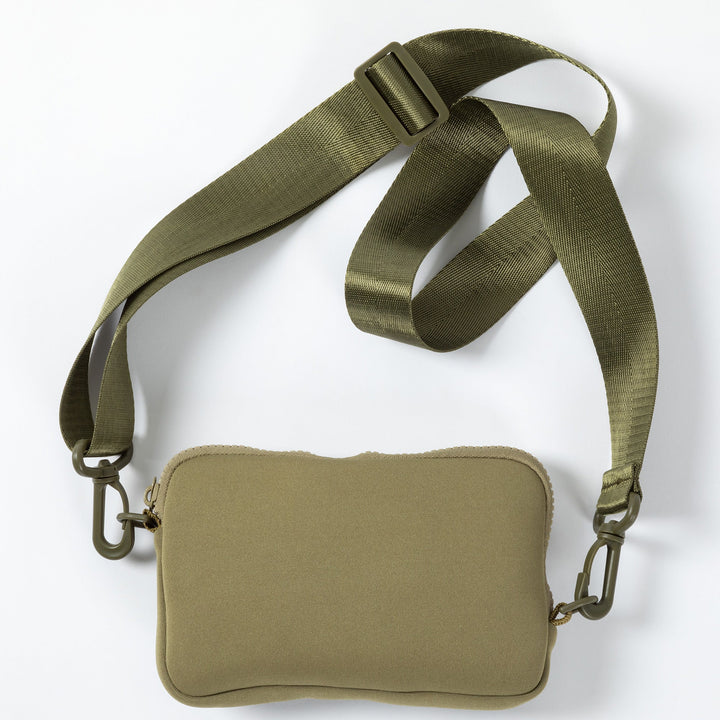 A minimalist's dream with a sporty look. Made with smooth, lightweight neoprene fabric, this crossbody bag features pockets inside and out, and an adjustable strap perfect for any length!