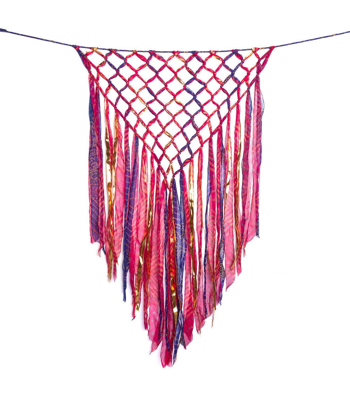 Add a pop of color to any room with these handcrafted wall hangings. Featuring vibrant, assorted sari macrame in a triangle tassel design with hints of metallic gold.