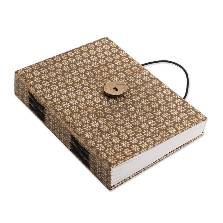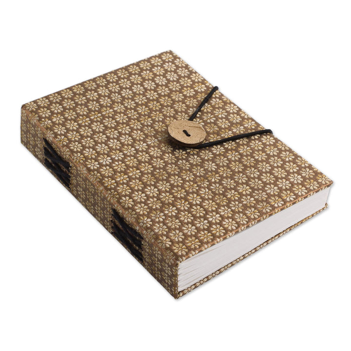 Golden flowers blossom in regal splendor on sepia brocade. From Asha Prabha, this beautiful journal is crafted by hand. The notebook features 100 blank pages of handmade paper, bound with cotton cords. A cord of black elastic secures it closed with a coconut shell button.