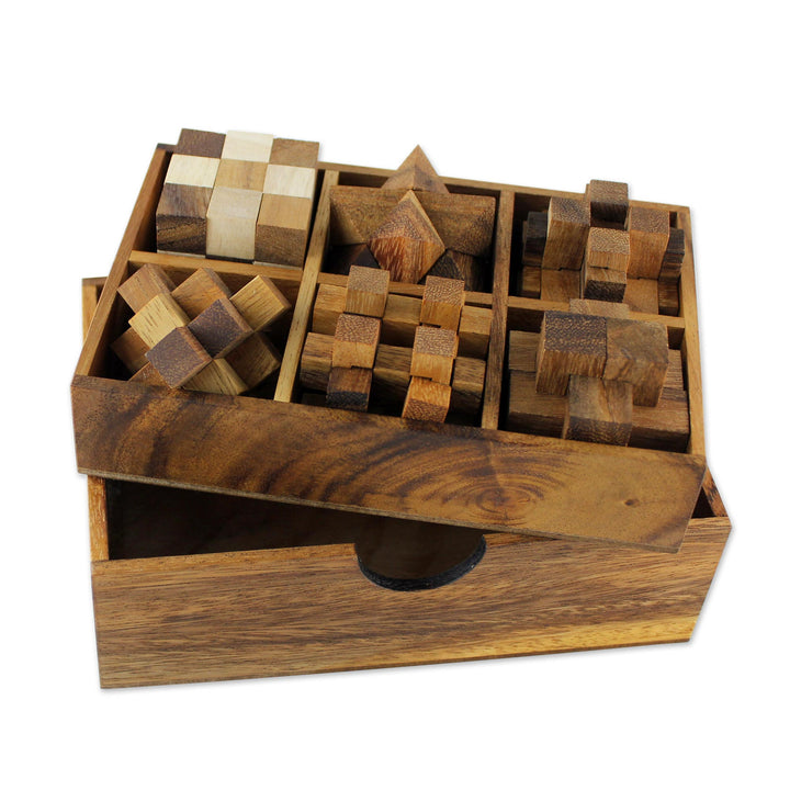 Keep everyone entertained with our hand crafted set of 6 or 12 wooden logic puzzle games. Games include Falling star, snake cube, ball in jail and more. Thai artisan Waraporn Khamsuk handcrafts each of the six puzzles that come in a handy storage box.