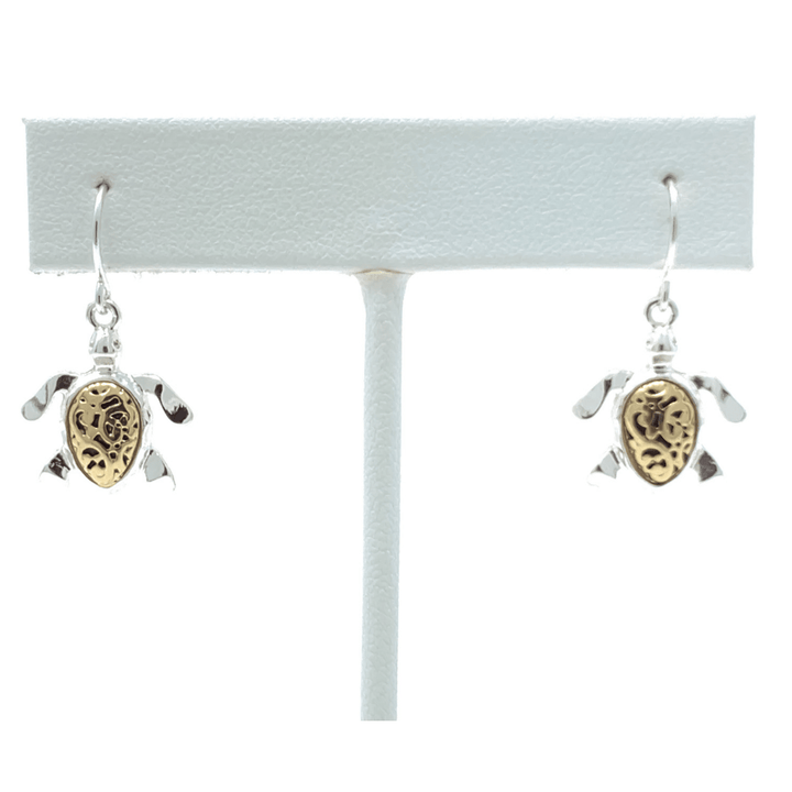 What a great and fun way to show your love for sea turtles! These sweet silver sea turtle with gold filigree earrings will dangle comfortably from your ears, and are sure to add a fun pop to any outfit!