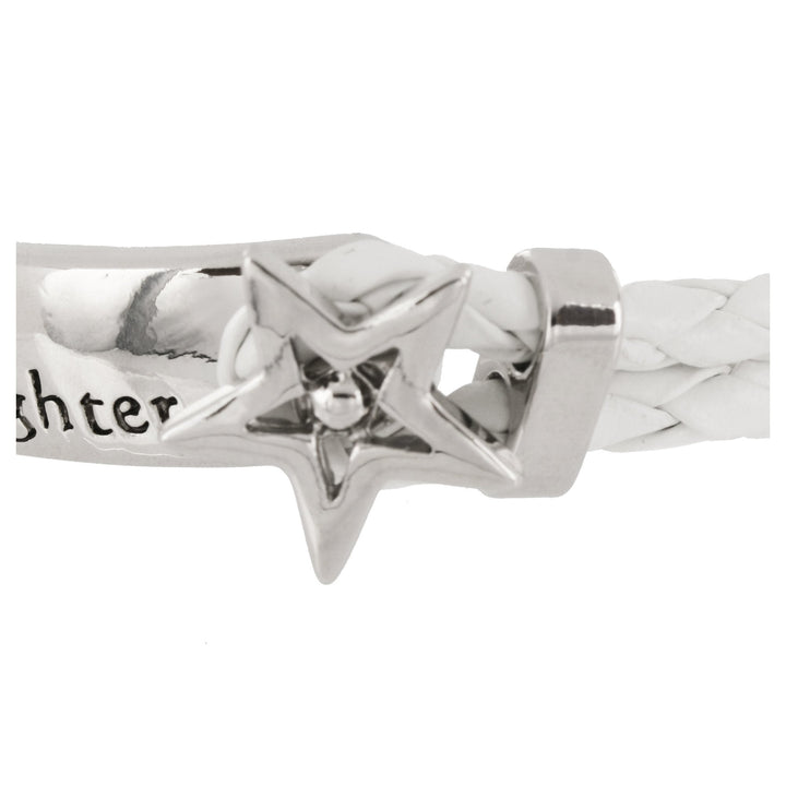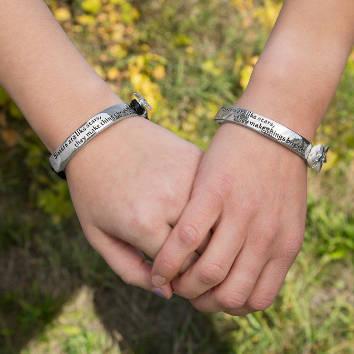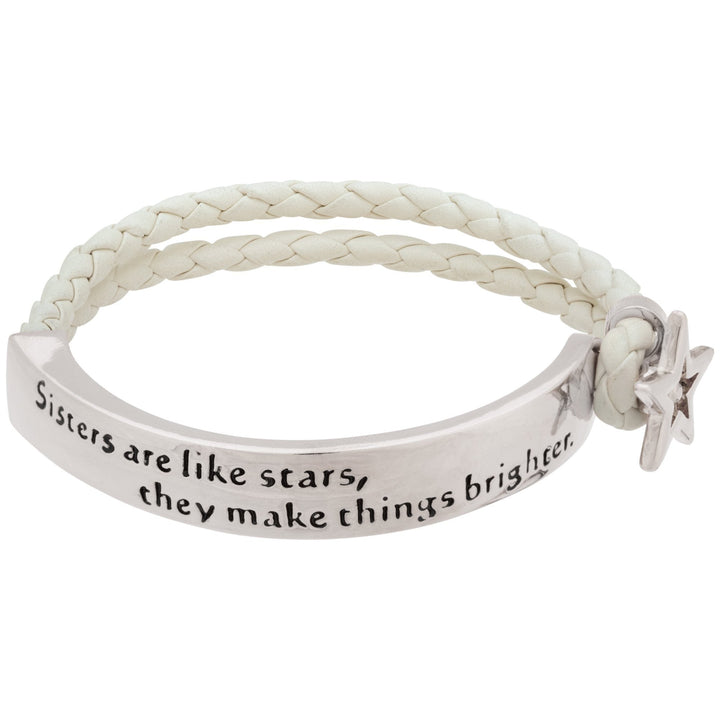 Sleek and modern, this mixed material bracelet will light up your sister's life, just as she has yours. One half is braided faux leather, connected to a highly-polished, nickel-free metal plate bearing a heartfelt inscription. A star charm serves as the clasp connecting the two -- a shining symbol of your sister's spirit!