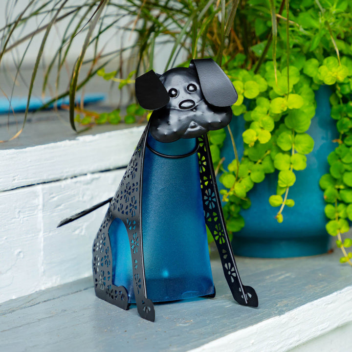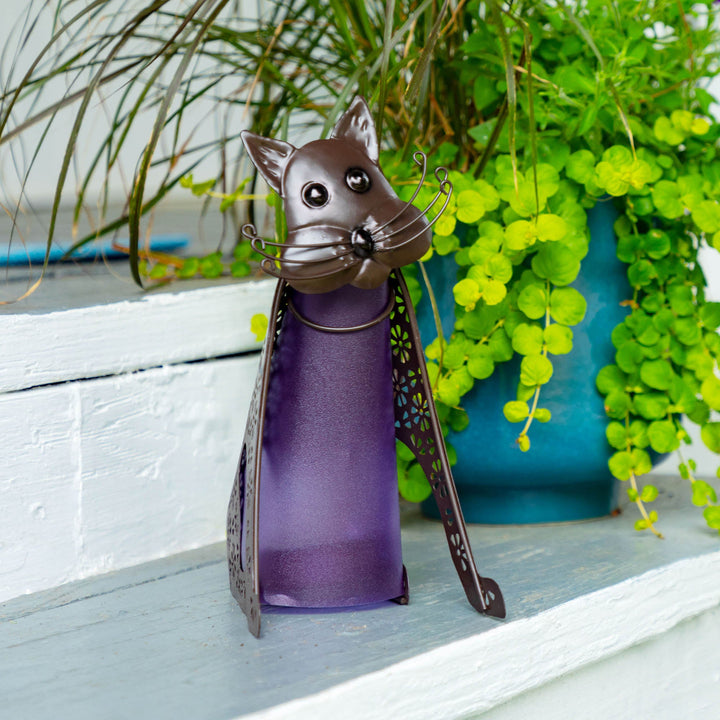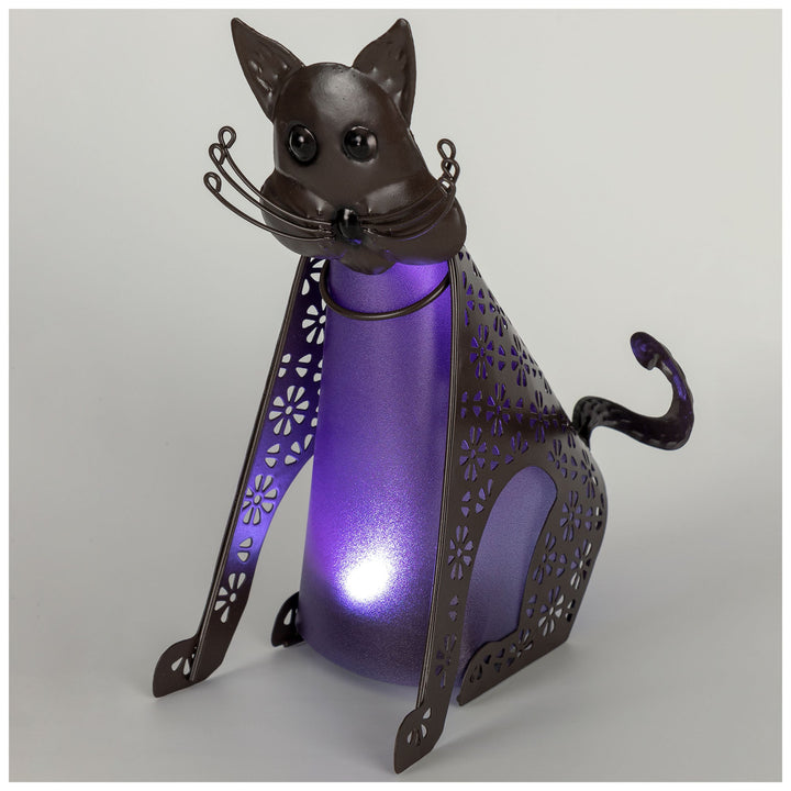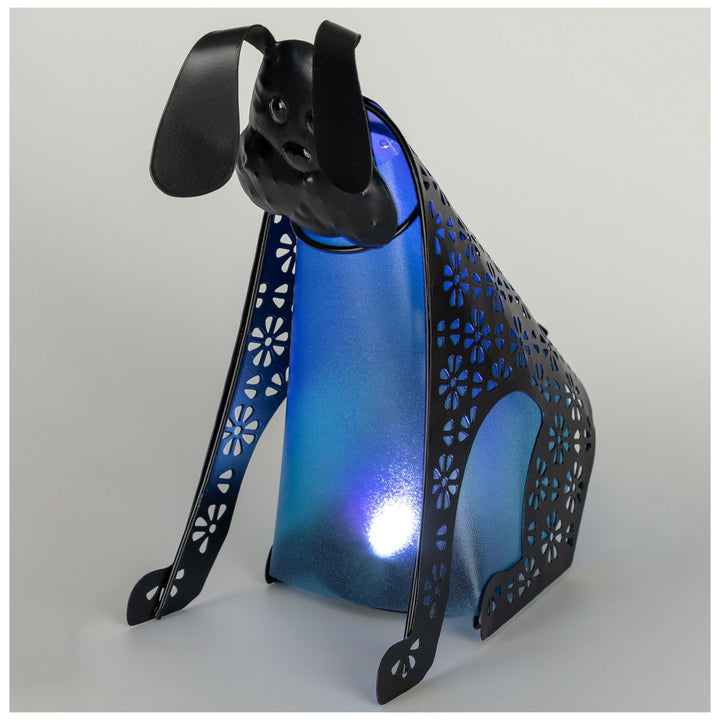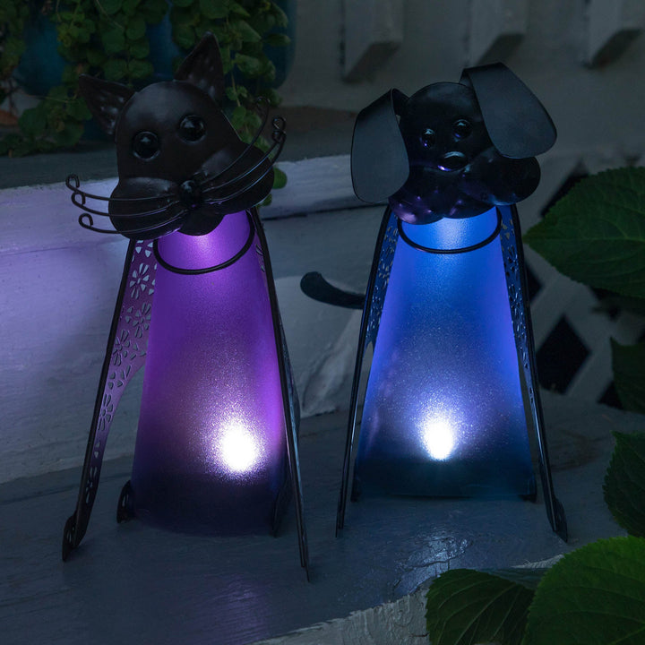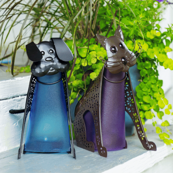 Sweetly sitting in your outdoor space, this cat or dog solar light softly glows at night, while bringing a cheery, colorful presence during the day. Crafted with iron for the body, and featuring cutout designs of flowers and swirls, each perky-eared pet charges during the day -- at least 6 hours in direct sunshine is ideal. As the sun sets, this outdoor light sculpture glows through the colorful plastic around the front.
