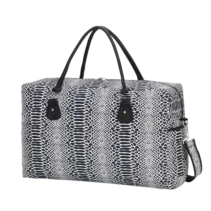 Carry all of your necessary travel or overnight essentials in one cute bag! Snakeskin inspired the cover design of the travel bag. With plenty of room for all of your essentials. This easy to carry bag comes with handles and a removable shoulder strap.