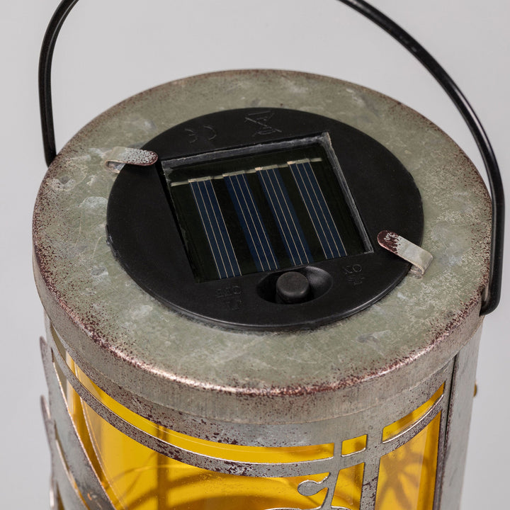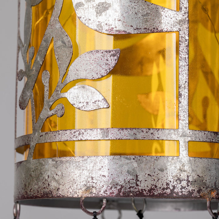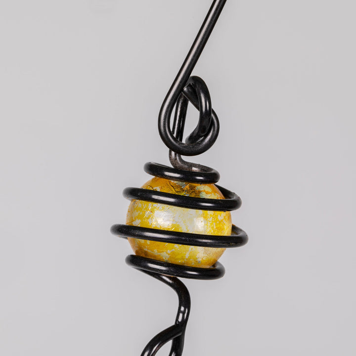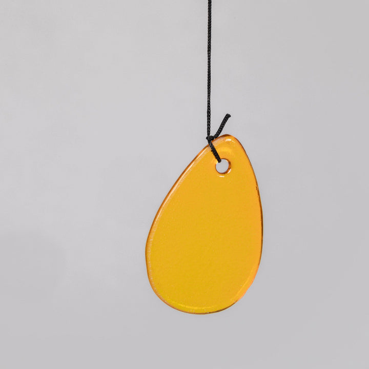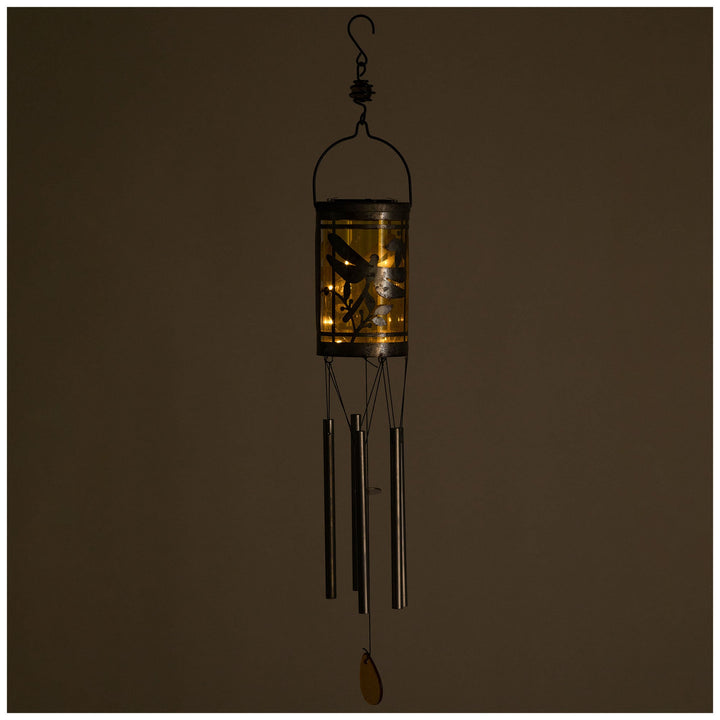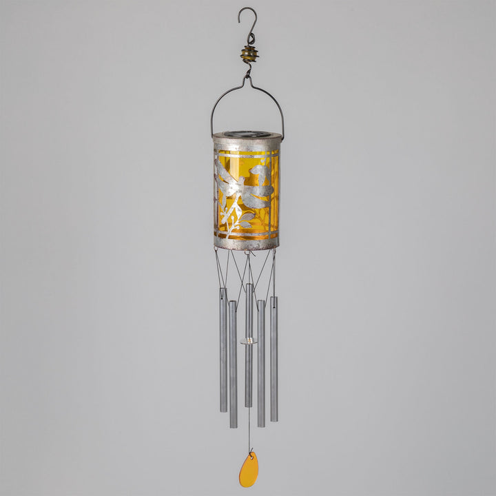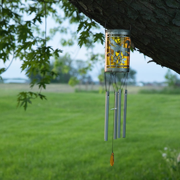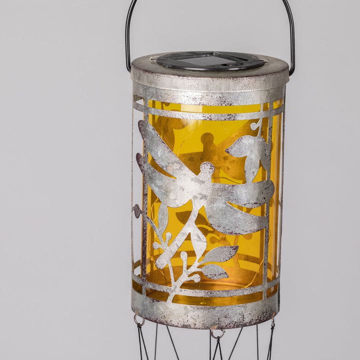 Dragonflies float along the golden yellow glass in this glowing solar powered wind chime. Hung outside in full sunlight, the solar component on top charges during the day, and emits a soft glow at night.
