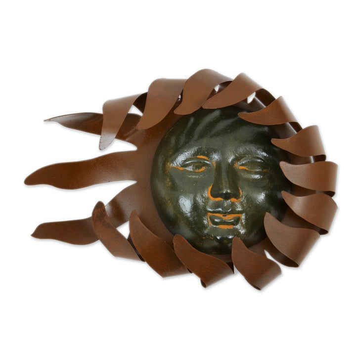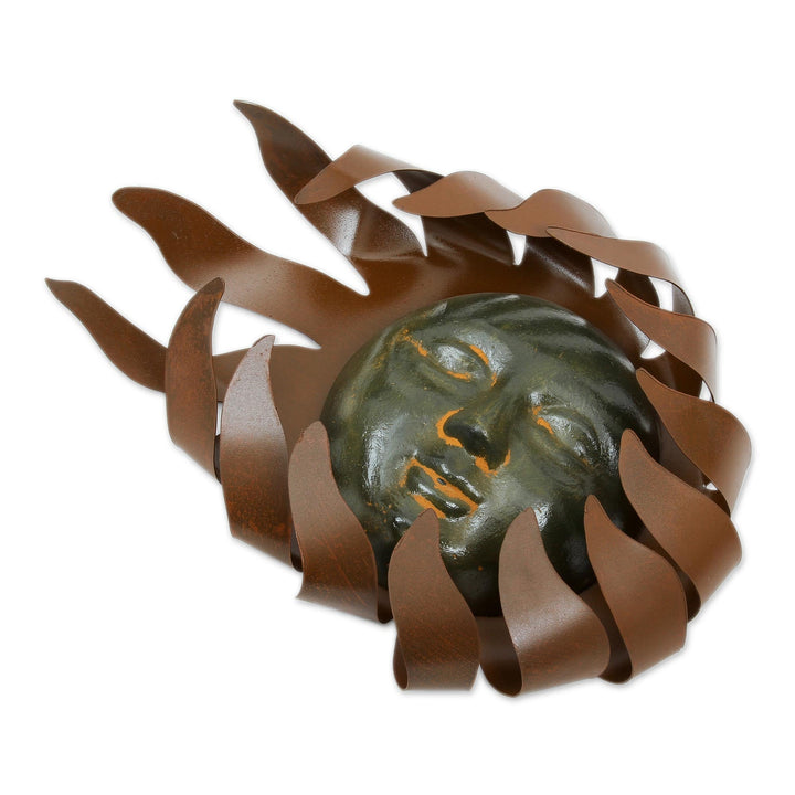 Artisan Marco Polo creates a sculpture of dramatic beauty; a slow, hot wind emanates from the sun itself, blowing the solar rays with its fiery breath. The freeform iron silhouette is centered by a mystical face of hand-painted ceramic. Includes a hook at the back for hanging.