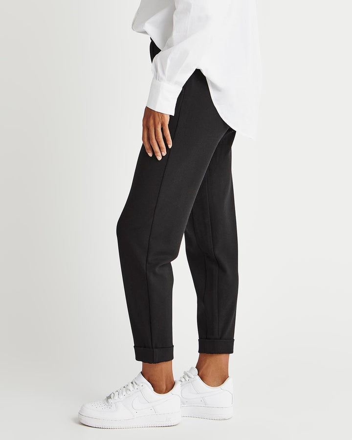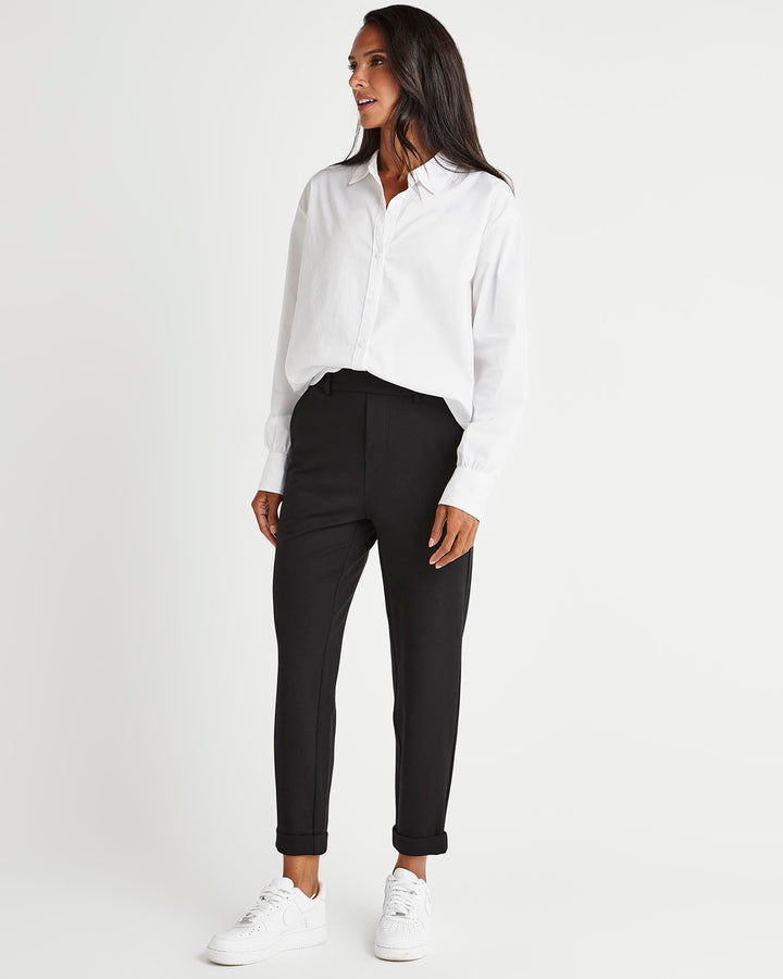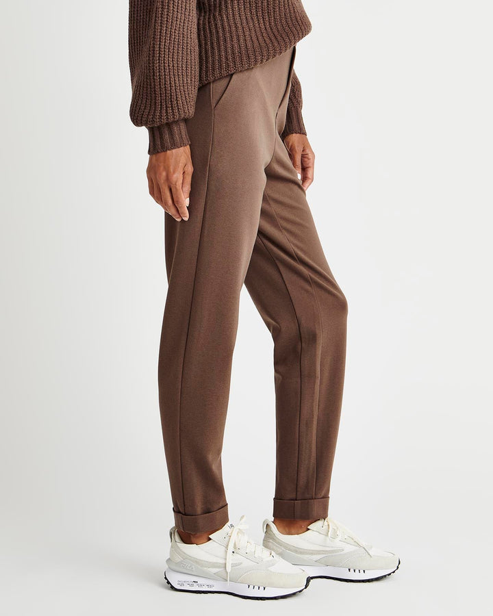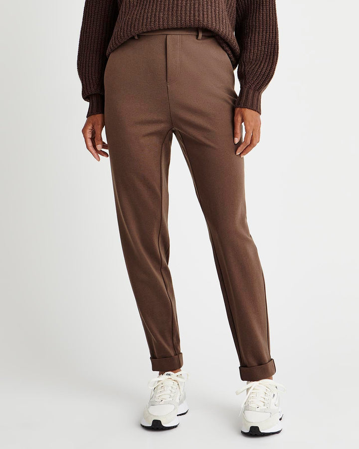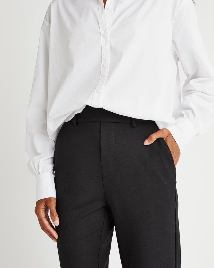 We teamed up with @cellajaneblog's Becky to bring you a versatile capsule collection of elevated everyday essentials designed to be mixed and matched for endless outfits. Tailored looks are made easy with this Fitted Trouser. Done from a wool spandex blend, this high-waisted pant is made in a slim fit with a straight leg and features an invisible side seam zipper, belt loops and side pockets. Its ankle-length hem is cuffed for an undone finish that still feels polished for every day. It looks effortless topped with an oversized sweater.
