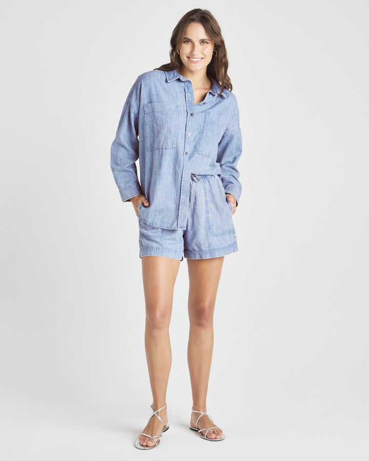 Channel @Cellajaneblog’s signature minimalist style with this collection of elevated essentials designed to help you transition into the season with ease. Swap your high-waisted jeans for these shorts once the weather warms. This pull-on style is cut from light wash denim with a high-waisted drawstring and patch pockets. Top it with the Splendid x @Cellajaneblog Oversized Denim Button Down for a denim-on-denim look.
