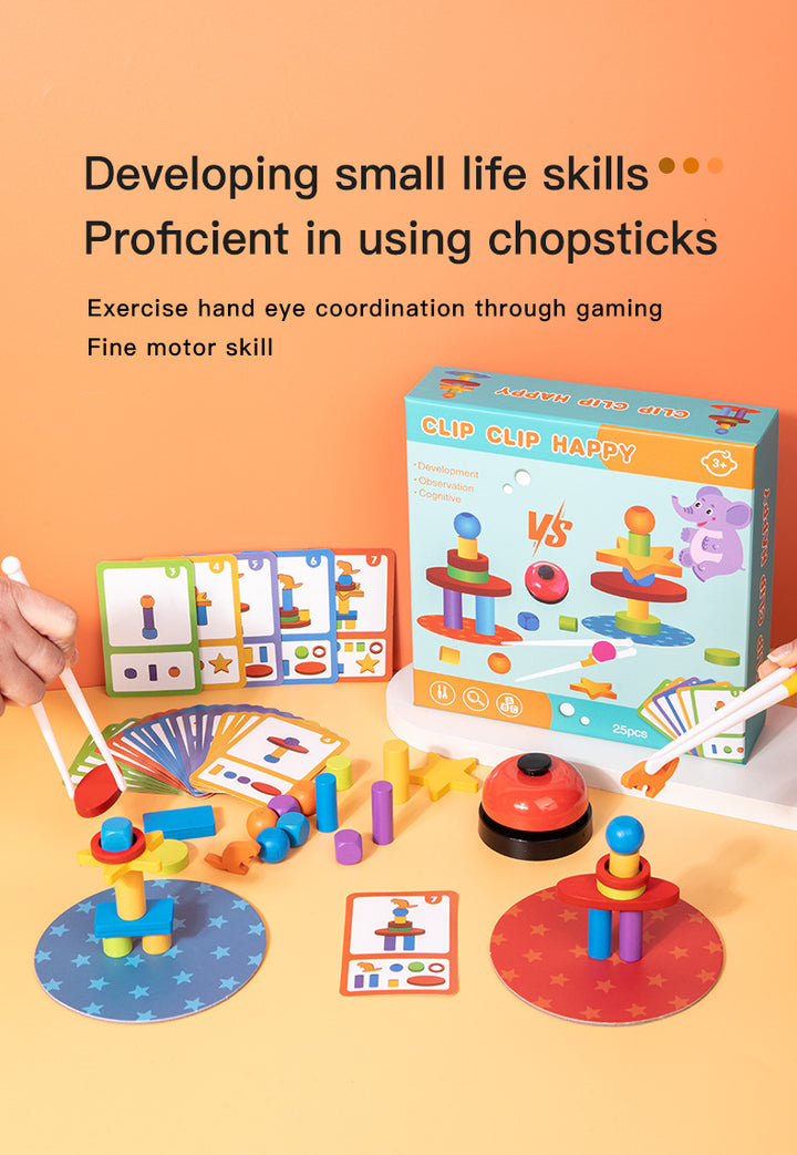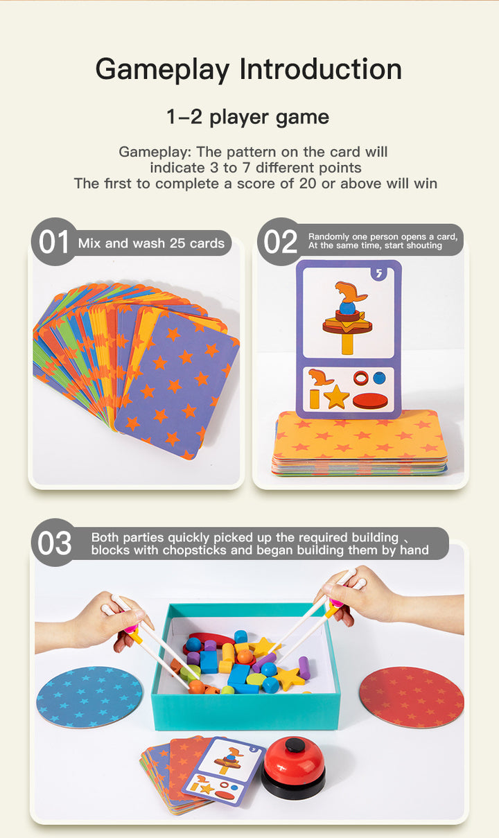 Package includes: 30 interlocking pieces;2 pairs of plastic chopsticks, 25 game cards, 5 advanced card