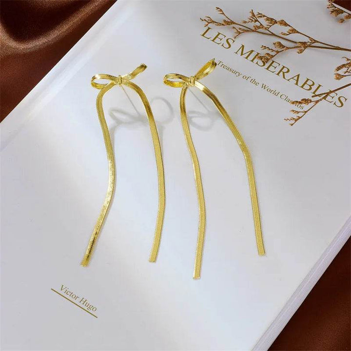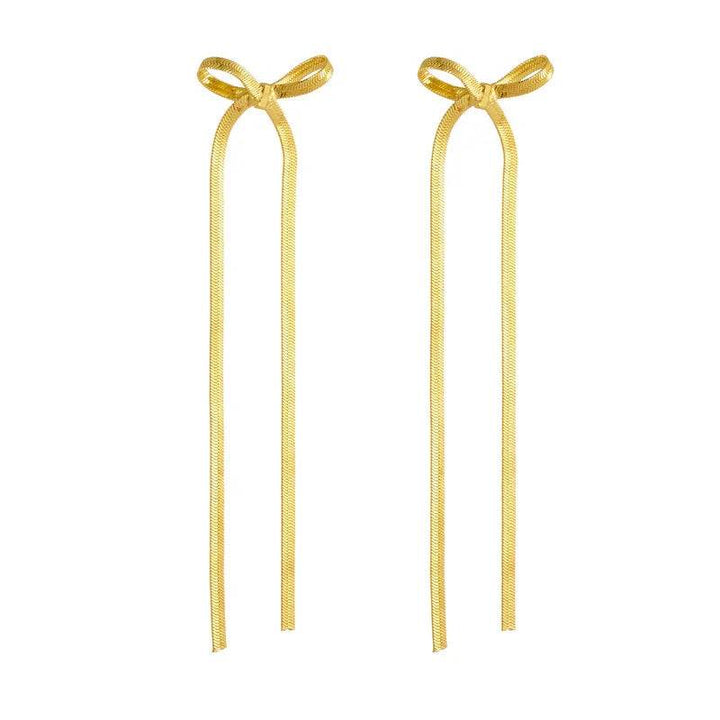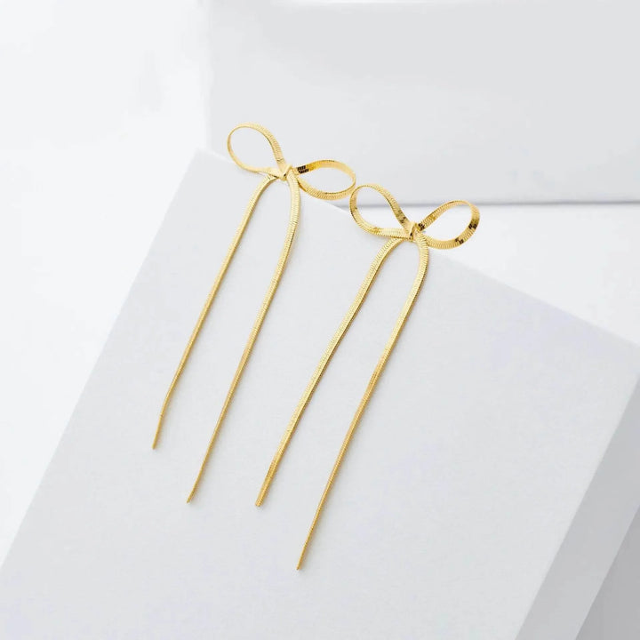 Elevate your style with our Fashion Long Tassel Bow Earrings, crafted from premium stainless steel for lasting beauty and comfort. These elegant statement pieces feature a unique flat snake chain design culminating in a charming bowknot, creating a graceful cascade that frames your face beautifully. Perfect for both everyday wear and special occasions, these trendy earrings add a touch of sophistication to any outfit. The stainless steel construction ensures they remain tarnish-resistant and hypoallergenic, making them ideal for sensitive ears. A thoughtful gift for the fashion-forward women and girls in your life, these versatile accessories blend contemporary trends with timeless appeal. Each pair arrives ready to impress in our signature packaging.