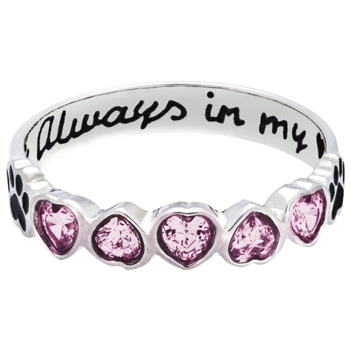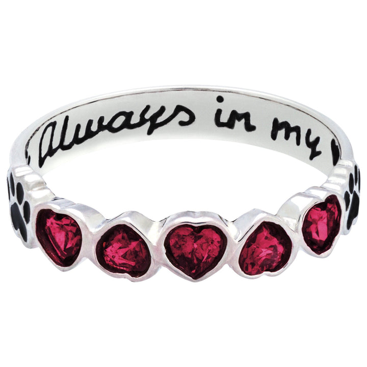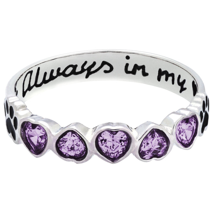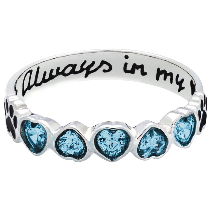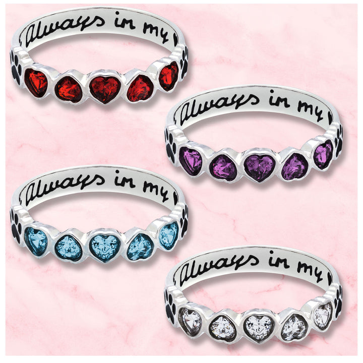 Show appreciation for pets present and past with a paw print, heart-shaped birthstone crystal ring that reads inside: "Always in my heart." Lovingly crafted by Bolivian artisans, this shimmering stackable ring allows you to display one for each pet, or mix colors for a dazzling look.