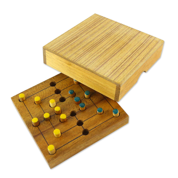 Handcrafted from rain tree wood, this striking game of strategy from Thailand is presented by Waraporn Khamsuk, featuring a square board with a grid of holes for the insertion of yellow and teal colored pegs. Intended for two players, the objective of the game is to place and reposition pegs until one player achieves three-in-a-row, much like traditional tic tac toe. The board raises to reveal an interior for storing the pegs.