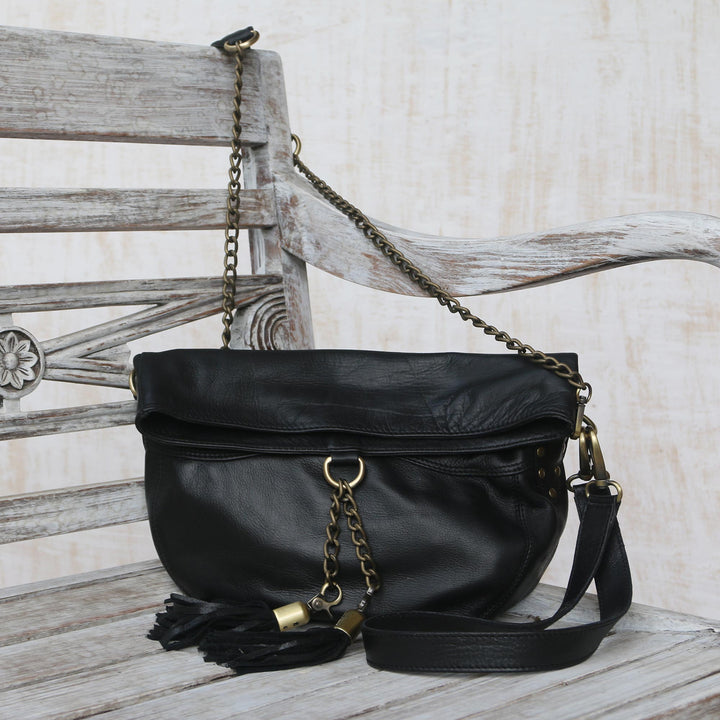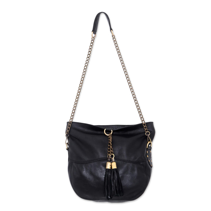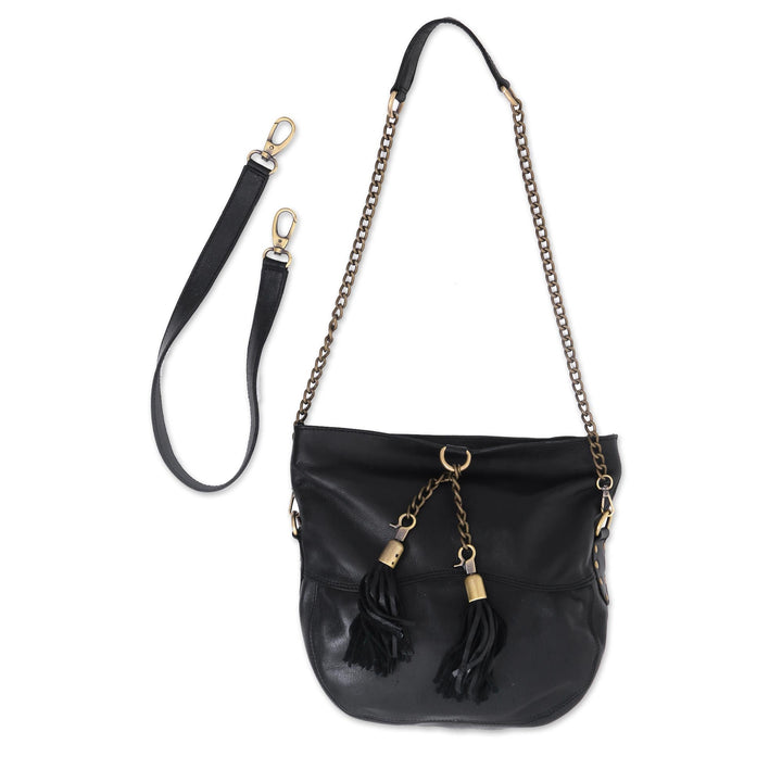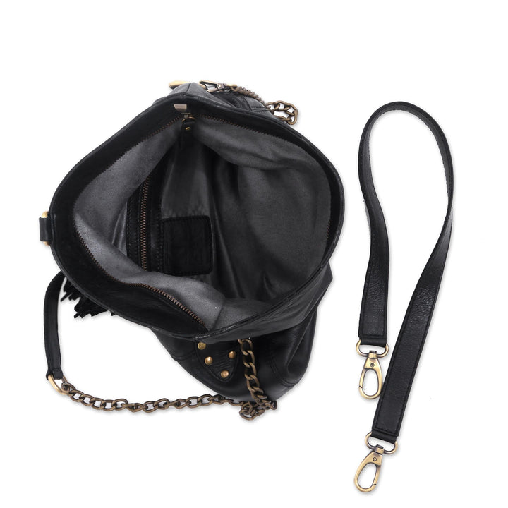 A perfect accessory to combine fashion with convenience, this shoulder bag is designed by Rella Tung of Indonesia. The black leather purse is lined with copper-colored faux suede and features an interior zip pocket. On the outside of the bag, two tassels and brown topstitching add decoration to the design. Two shoulder straps of different lengths can be attached and removed for ultimate practicality.