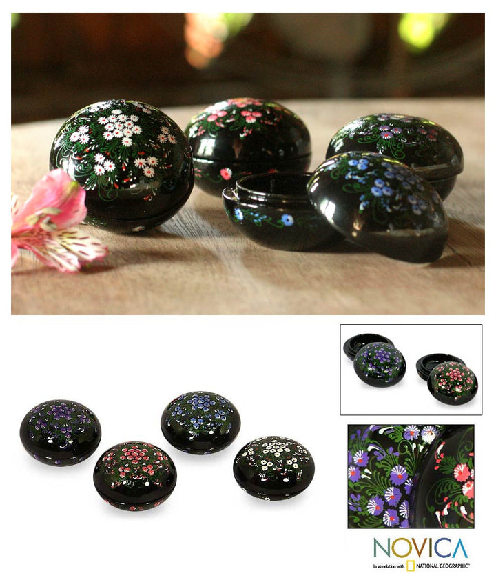 These exquisite boxes painted with phlox blooms will add a graceful look to any collection. Finely hand-painted in white, violet, blue and pink, they grace four handcrafted boxes. Nantana Sompamitre presents an extraordinary example of Thai lacquer art.
