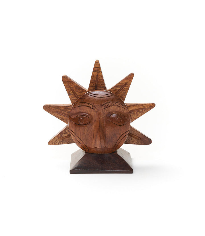This eyeglass holder features a unique sun design with hand carved detail and sturdy rectangular base for stylish safekeeping.
