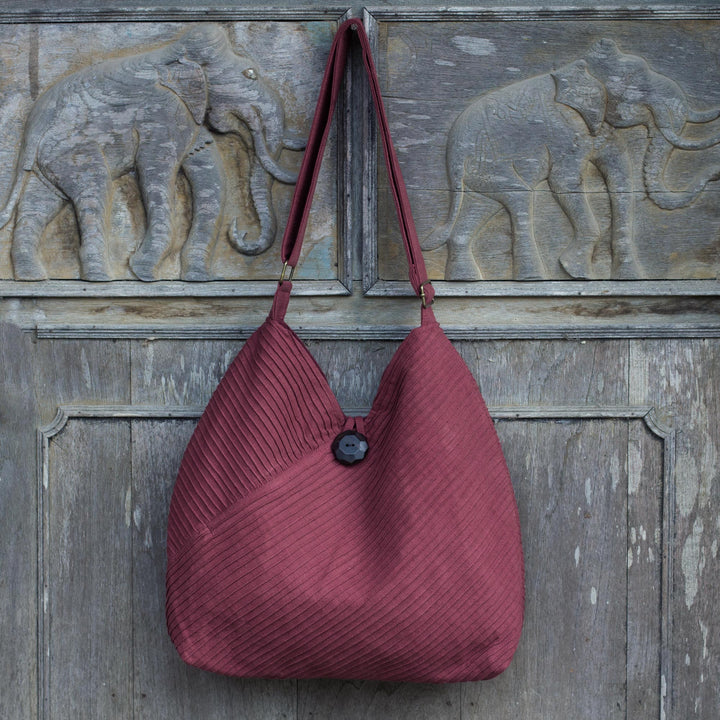Elegance is evident in the modern design of this wine-red hobo bag from Thai's Vinita's flair for style. A removable coin purse adds to its versatile allure. Two exterior pockets are camouflaged among the diagonal pin tucks that shape the cotton shoulder bag. The fully-lined interior includes two open pockets as well as a zipper pocket. The shoulder strap's length is adjustable and an ornate rain tree wood button closes the bag.