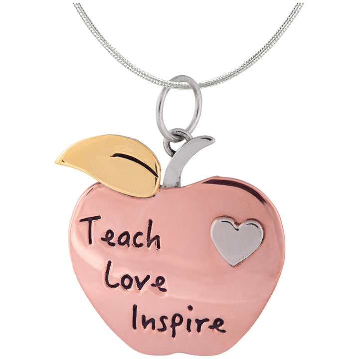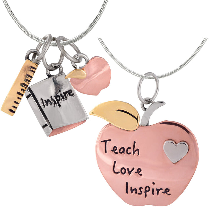 Changing a student's life for the better -- teaching isn't just a job, it's a calling! Each mixed metal pendant is handmade by skilled artisans, featuring the core principles of being an educator "Teach Love Inspire" on the apple pendant, or the collection of apple, book, and ruler charms which reads "Inspire."