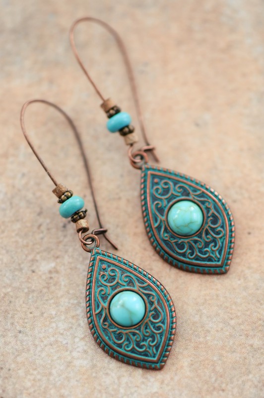 Gorgeous worn broze with teal and turqouise accents. These earrings add flare to your outfit and are so lightweight and easy to wear!