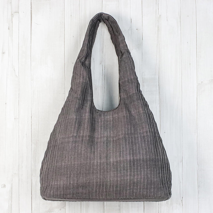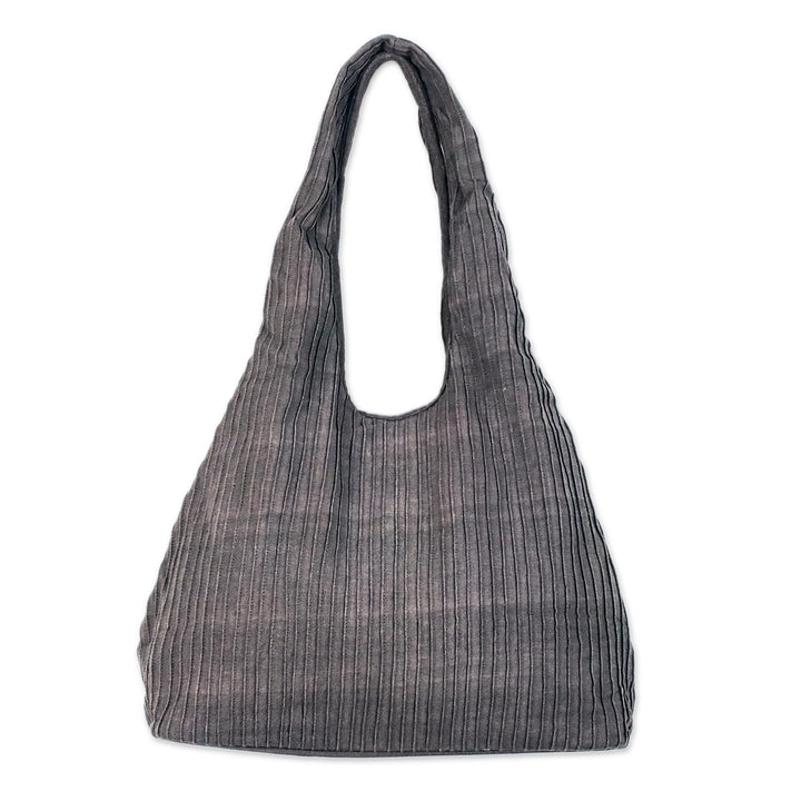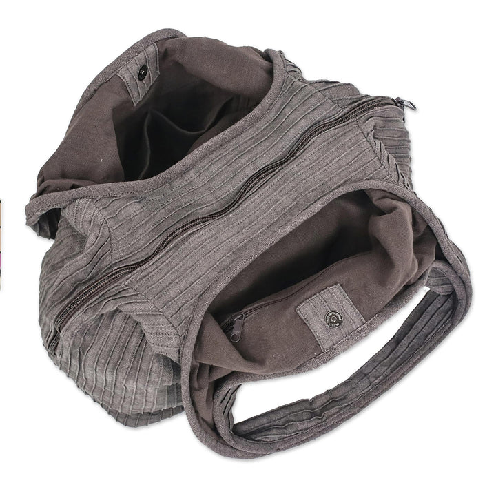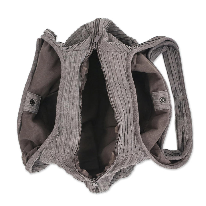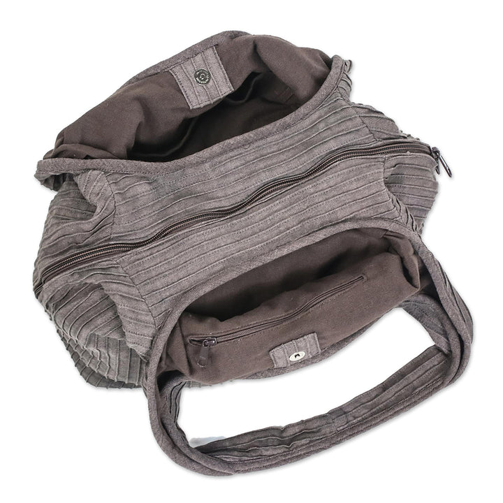 With a pintucked exterior made from 100% cotton, this taupe cotton shoulder bag is presented by Thailand's Vinita. The chic handbag opens to reveal a brown cotton lining, with compartments on both sides that are secured with magnetic snaps and a main center compartment that closes with a zipper.