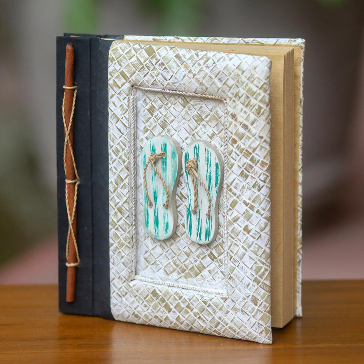 Filled with 50 pages of rice straw paper pages, this journal is designed to inspire the environmentally minded. Komang Sulaksana crafts the journal by hand, weaving pandan leaves for the covers, and adorning the black fabric spine with cinnamon sticks and albesia wood green flipflops. The Balinese artisan binds the notebook with agel cords.