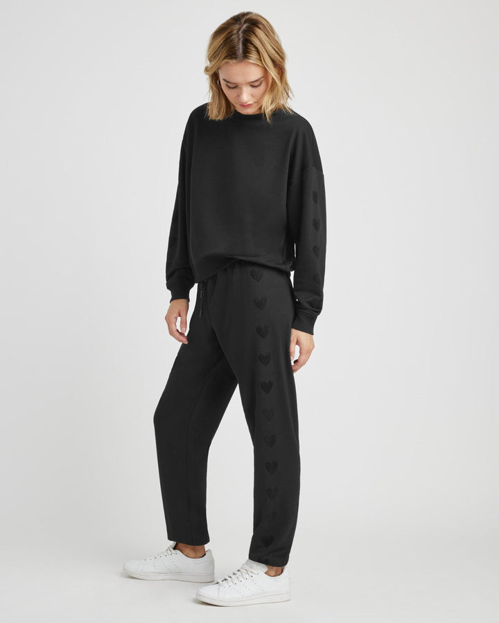 We added some extra charm to our Tia Soft Fleece Jogger with this version that features flocked hearts down the side leg. Made from our Soft Fleece fabrication-- fibers are brushed for softness, lined with a touch of fleece and made with a touch of stretch. It's topped with a drawstring waistband and a cuffed hem for a perfect fit. Top it with the matching Tia Soft Fleece Heart Sweatshirt for an adorable lounge look.