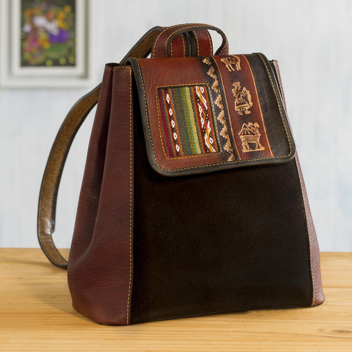 Using skills handed down from her father, Peru's Kathiana Quispe hand-tools this beautiful leather backpack with Andean motifs. The brown leather is combined with black suede and accented with a segment of handwoven wool tapestry. The shoulder straps feature a center zipper, so that the bag can also be slung over one shoulder if desired. The fully-lined interior features a zipper pocket for small items; the bag is secured by a magnetic snap.