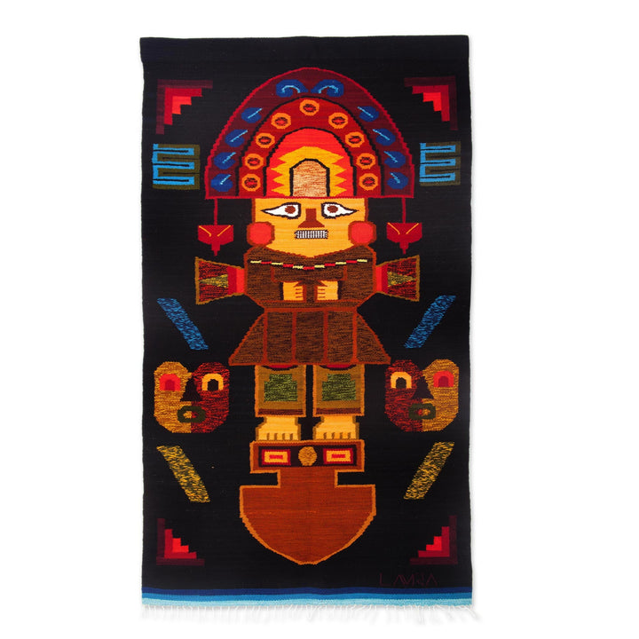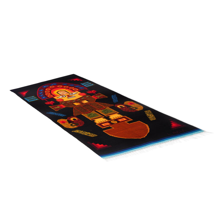 A stylized tumi axe is depicted in this area rug from Peru. The tumi was a ceremonial blade characteristic of ancient cultures such as the Moche, Chimu, and Inca. A typical tumi axe features a curved blade at one end, its handle often adorned with a small sculpture that depicts a legendary or historical figure. The composition on this rug is realized in a variety of colors against a body of black. Andean artisan David Laura Zanabria designs the rug, weaving it by hand from wool on an artisanal loom.