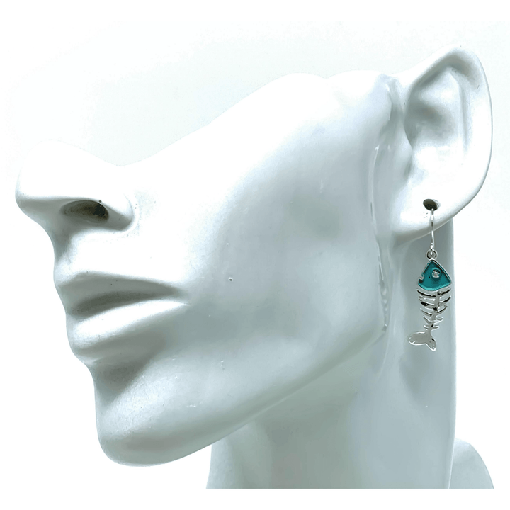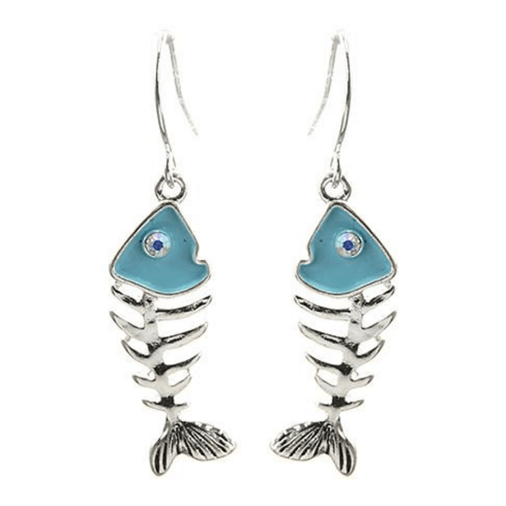 These fetching silver fish earrings feature a fish bone motif, beautifully crafted with turquoise enamel and rhinestone accents. Captivating color-changing rhinestone makes for an eye-catching look. Trendy beach earrings is always in style, even after the summer months end.