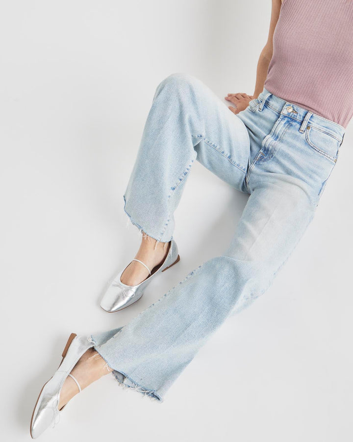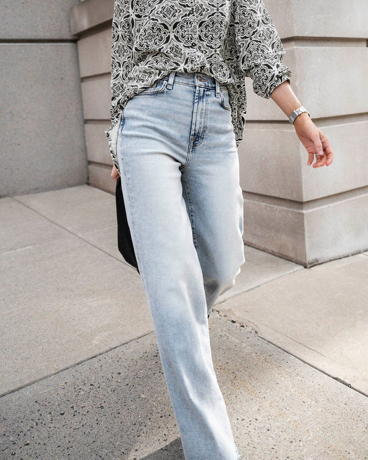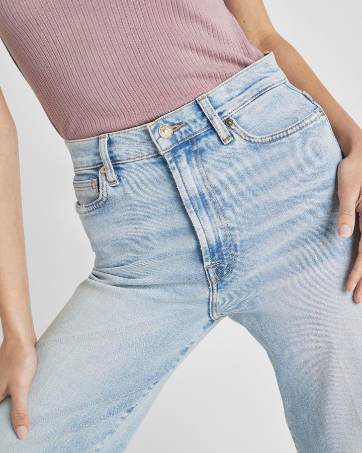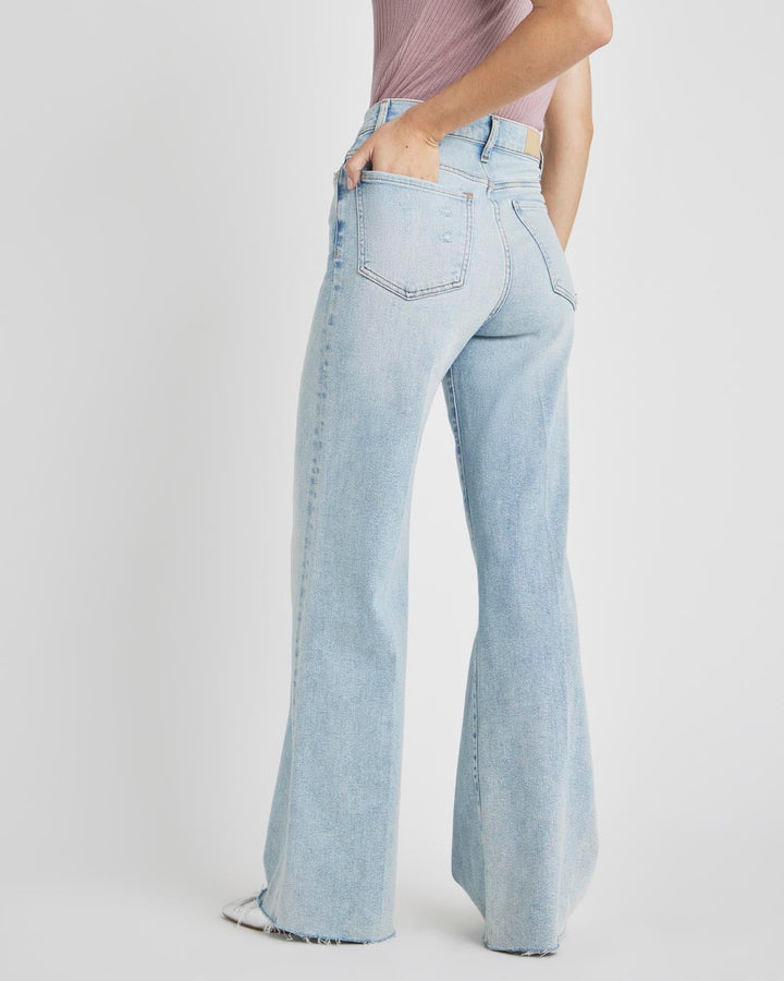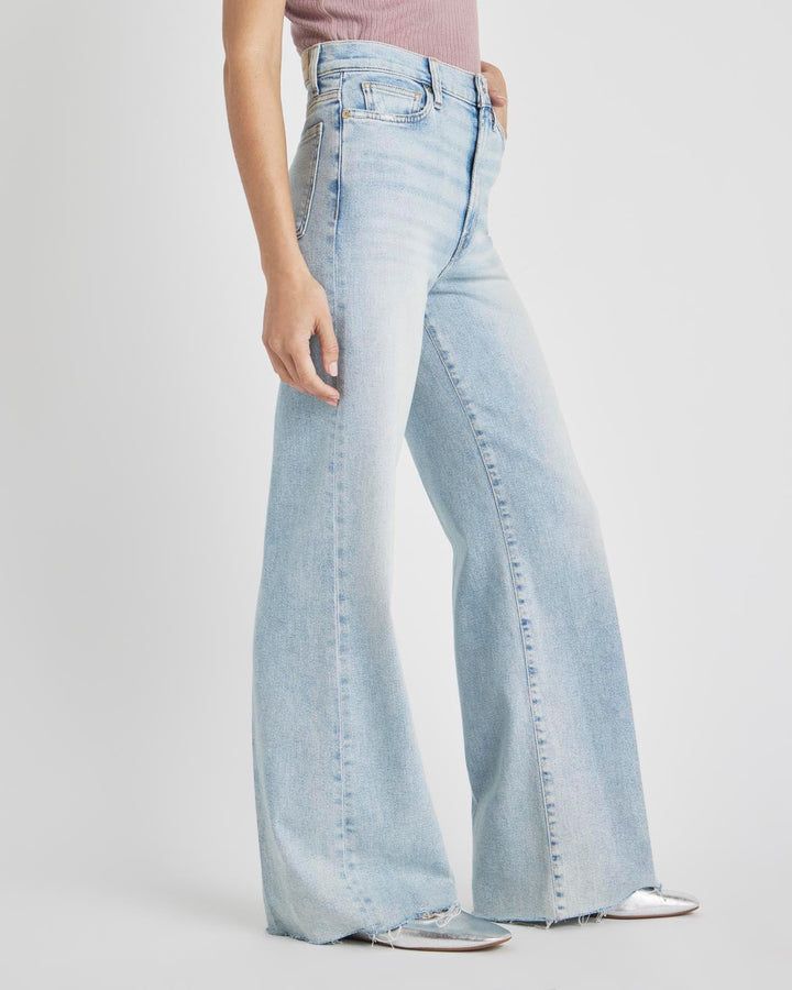 This light wash jean has an ultra high waist that complements all your favorite crop tops and tucked-in tees, while its super wide leg is finished with a raw hem for a laidback mood.