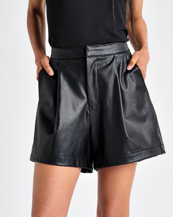 We're obsessed with these Vegan Leather Shorts. Designed in a high waist, trouser short silhoeutte, these vegan leather shorts feature side and back pockets and front pleats for a cool menswear inspired look. Pair with boots and tights for a cool fall-foward look.