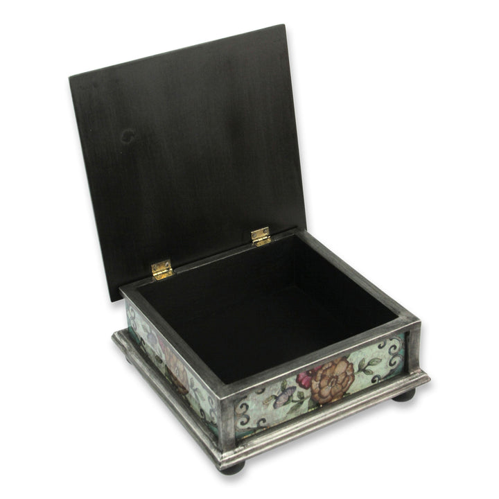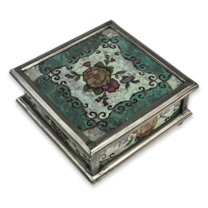 Caressed by agua and turquoise, luscious blossoms flourish amid emerald foliage. Asunta Pelaez hand-paints the motifs on the reverse side of glass panes, giving them a wonderful clarity. A traditional Cajamarca handicraft, the panes adorn a jewelry box.