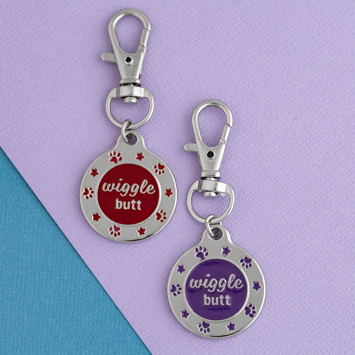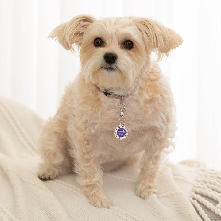 Sweetly suspended from your furry friend's collar, this pet tag incites chuckles while speaking the tail-wagging truth! A parade of paw prints and stars encircle the phrase "wiggle butt," with a blank back perfect for engraving.