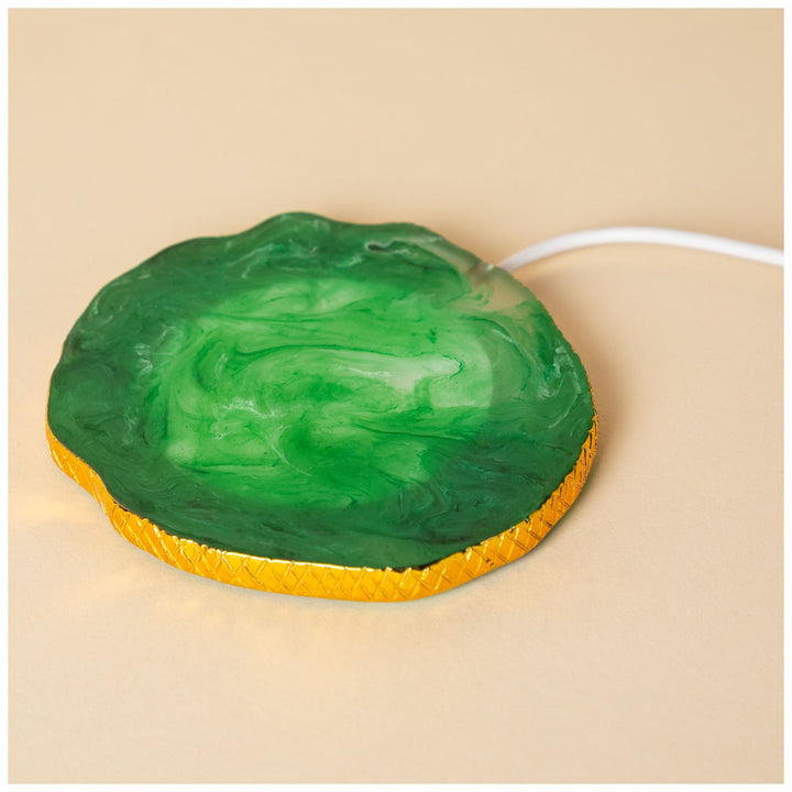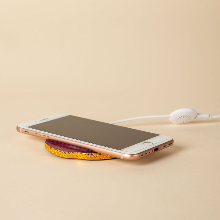 These unique charging pads elegantly combine the natural beauty of agate crystals with wireless technology. When you need a charge, simply place any wirelessly compatible device on the pad. These pads look like agate crystal with a gold trim, allowing them to double as a chic piece of decor when not in use.