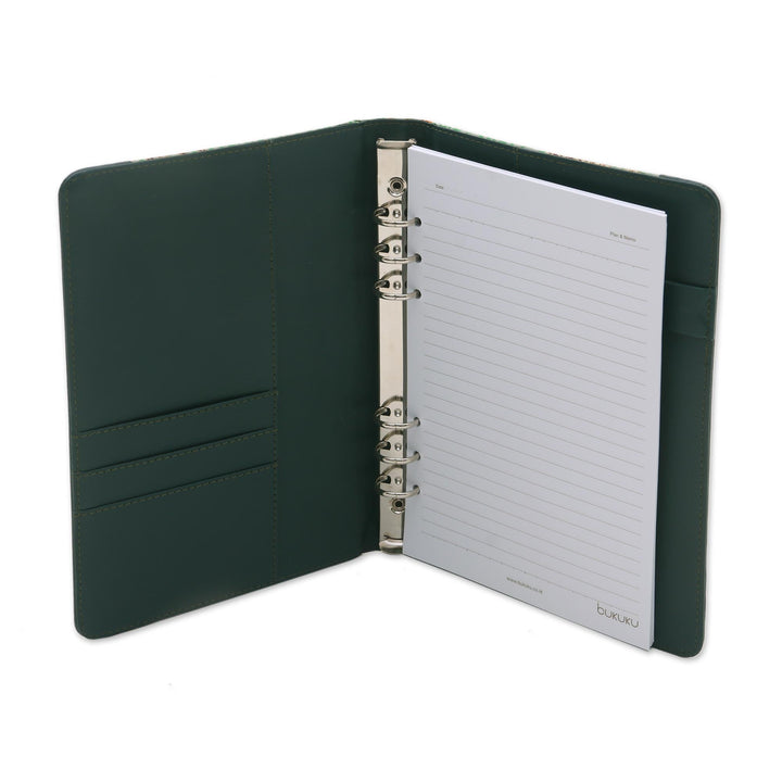 Handmade of cotton and faux leather, this planner will bring you to your very own writer's Eden. The artisans at Bukuku create the planner, featuring a deep blue color with traditional batik motifs. Inside, the planner features 50 ruled cotton pages held secure by steel rings that open. The inside of the planner's cover features three slots for storing business cards.